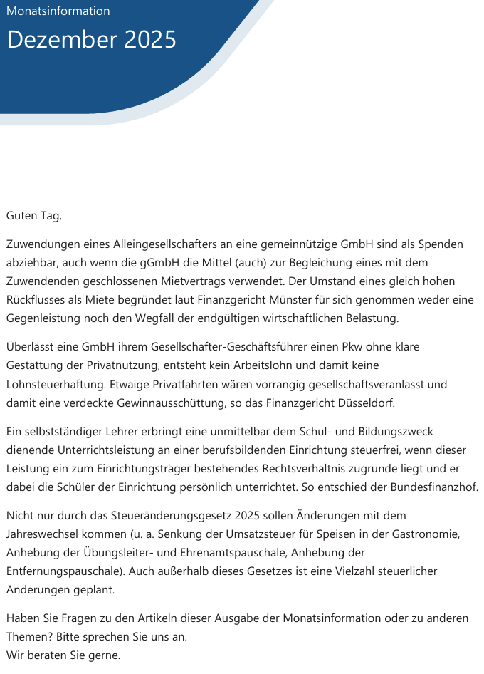 Schadensersatz des Arbeitgebers wegen Mobbings, Diskriminierung oder sexueller Belästigung ist steuerfrei Das Finanzgericht (FG) Rheinland-Pfalz hat entschieden, dass eine Entschädigung, die ein Arbeitgeber seinem Arbeitnehmer wegen Diskriminierung zahlen muss, auch dann steuerfrei ist, also keinen Arbeitslohn darstellt. Das gilt auch dann wenn der Arbeitgeber den Vorwurf bestreitet und sich lediglich in einem gerichtlichen Vergleich zur Zahlung bereit erklärt. Häusliches Arbeitszimmer eines Selbständigen trotz vorhandener Praxisräume Nach dem Einkommensteuergesetz dürfen Aufwendungen für ein häusliches Arbeitszimmer nur abgezogen werden, wenn für die betriebliche oder berufliche Tätigkeit kein anderer Arbeitsplatz zur Verfügung steht. Einem Selbständigen ist dabei nicht jeder Schreibtischarbeitsplatz in seinen Betriebsräumen zwangsläufig als „anderer Arbeitsplatz“ zumutbar. Finanzgericht: PC-gestütztes Kassensystem ist grundsätzlich manipulationsanfällig Das Finanzgericht (FG) Münster hat zu der Frage Stellung genommen, unter welchen Voraussetzungen ein PC-gestütztes Kassensystem ausnahmsweise als nicht manipulierbar angesehen werden kann. Im Streitfall hat er ein auf der Software Microsoft Access basierendes System als manipulationsanfällig angesehen. Doppelte Haushaltsführung: Einrichtung der Wohnung unbegrenzt abziehbar Das Finanzgericht (FG) Düsseldorf hat – entgegen der Finanzverwaltung – entschieden, dass die Kosten für die notwendige Einrichtung der Wohnung im Rahmen einer beruflich veranlassten doppelten Haushaltsführung nicht zu den nur begrenzt abzugsfähigen Unterkunftskosten gehören. Verlustausgleich im Bereich der Kapitaleinkünfte möglich Der Bundesfinanzhof (BFH) hat entschieden, dass Verluste aus Kapitalvermögen, das der sog. Abgeltungsteuer unterliegt, mit Gewinnen aus solchem Kapitalvermögen, das nach dem Regeltarif zu besteuern ist, verrechnet werden können. Hierzu ist allerdings erforderlich, dass vom Steuerpflichtigen die sog. Günstigerprüfung beantragt wird.